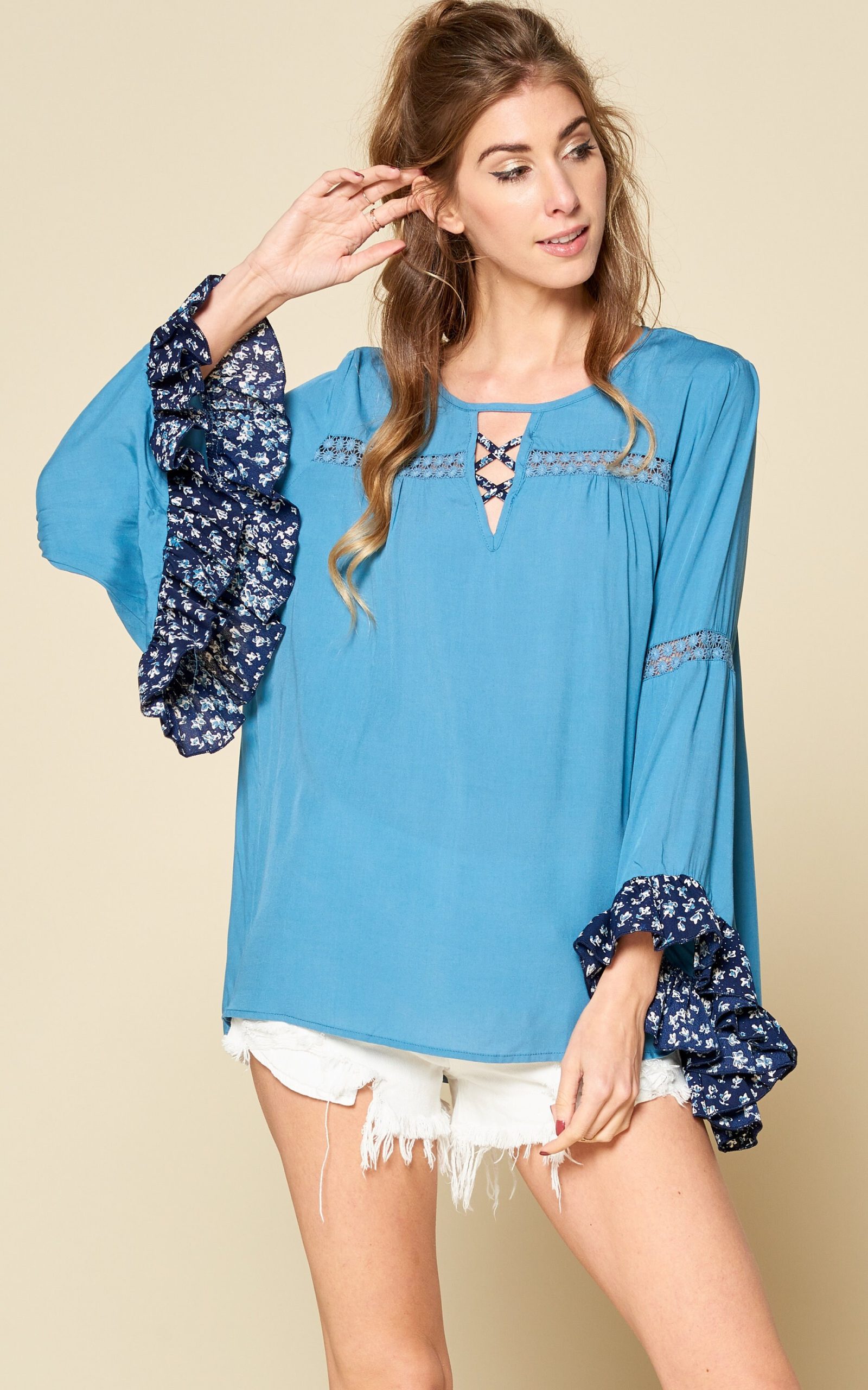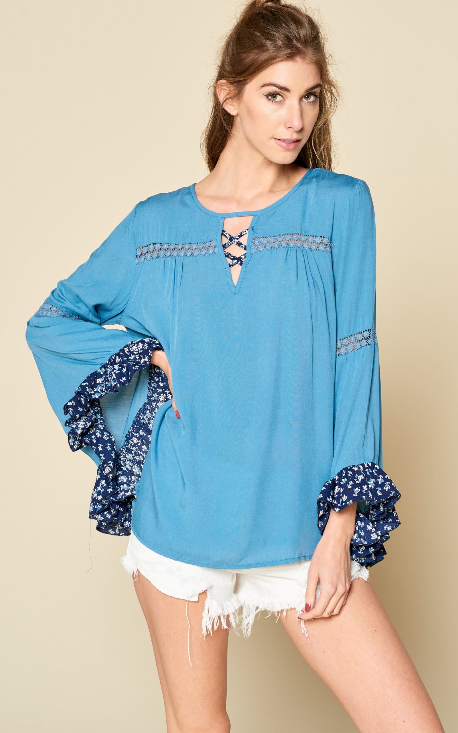 Bell sleeved blouse featured in floral print with crochet detail.